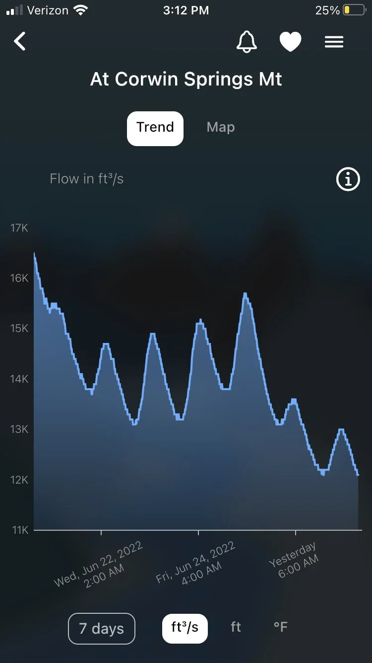The Yellowstone will start to fish very soon. We are hoping to take our first float trips after run-off this weekend. If you are floating the river, definitely choose a longer float as the water is moving!. Fish the slow water right against the banks. Salmon Flies should be popping around the first week of July. There are some new channels, or filled in old channels, that will be fun to explore. Check out the chart of river flow to the left. Every morning, the river jumps a little bit, but then it goes down. This is a normal post-runoff trend with a little bit of snow melt each day. We should have great flows from early July through October this year. Give us a call, and we will see you on the River.