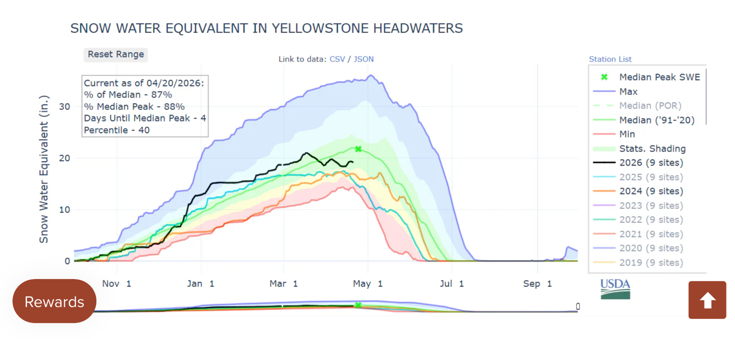 It’s no secret this was a mild winter across the West, and additional moisture is always welcome. That said, conditions here are holding up better than in some neighboring states. The Upper Yellowstone snowpack is currently around 88% of average snow-water equivalent—not ideal, but still workable.